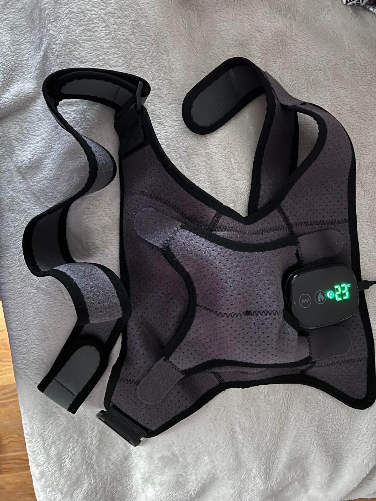 I decided to try this massager because it’s reasonably priced. I have been struggling with shoulder and arm problems for the past year. I could barely hold a cup of tea and was a candidate for surgery, but given my age, I was not interested in an operation with uncertain outcomes, so I started looking for alternative solutions. The day I received it I used it 3 different times. It was so relieving to use because my shoulder was so stiff. I stuck with it and with each use my shoulder got better and better. I use it at least once in the morning and once in the evening and each cycle lasts about 15 mins. But you can turn it on and let it run another cycle…the battery lasts a long time before needing to recharge. I’ve used it for an hr or more in 15-minute increments and it hasn’t run out. Then I recharge it so it will be ready the next time I use it. I have a large chest, but it fits me no problem. It’s easy to use and put on and there are 3 different levels of heat and 3 different massage types you can choose. It’s quiet when it’s running. It works kind of like a heat pad, it gently warms the area and soothes pain. Definitely recommend this product. Comes with the charging cord and instructions. It’s been a lifesaver for me!